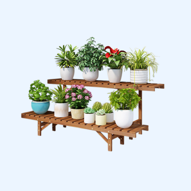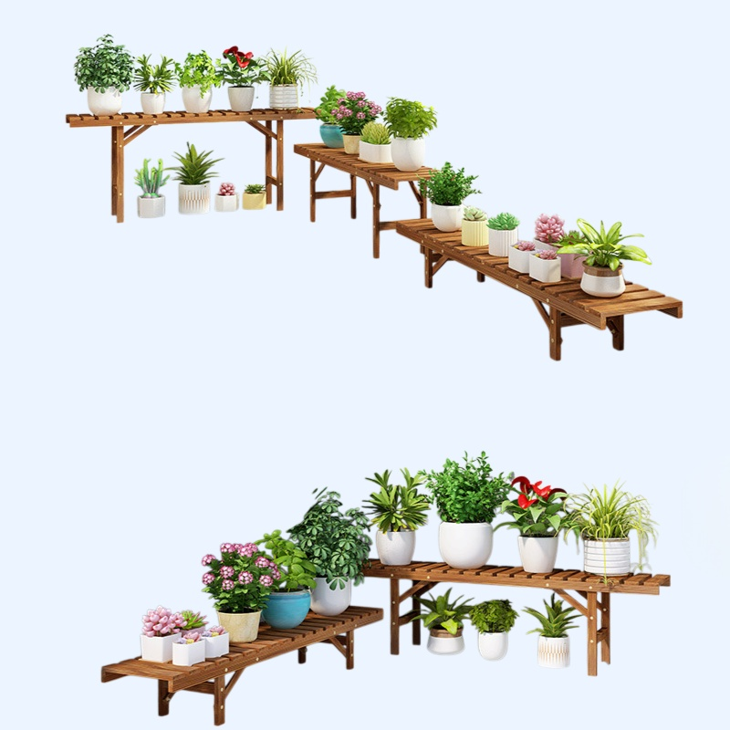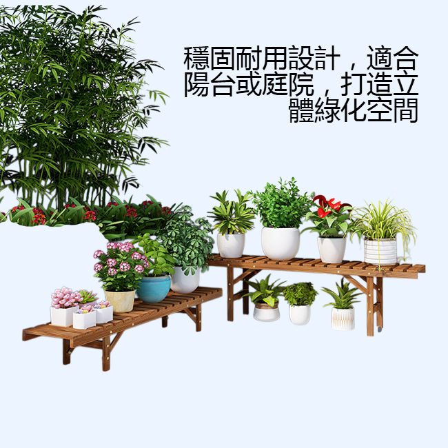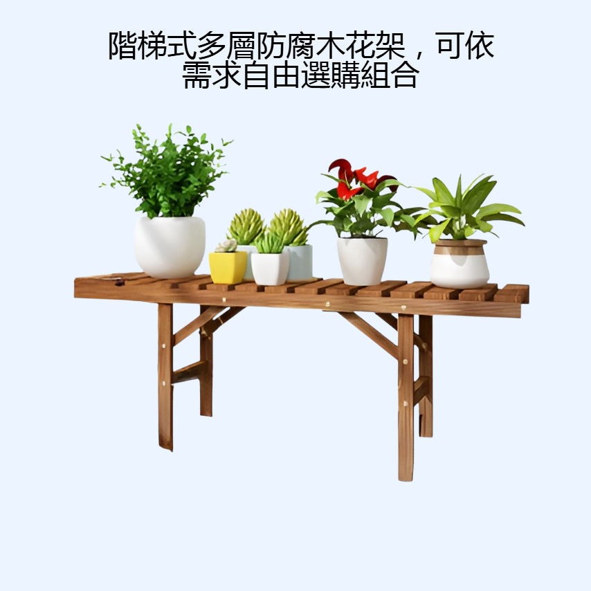 多層階梯設計,空間利用高效,防腐木質耐候耐用,適合室內外擺放,多種尺寸可選,輕鬆組裝,提升居家綠意。